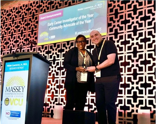 Dr. Can Senkal, Assistant Professor in the Department of Cellular, Molecular, and Genetic Medicine, receives the Early Career Investigator of the Year Award from the VCU Massey Comprehensive Cancer Center at the 2025 Walter Lawrence Research Retreat.