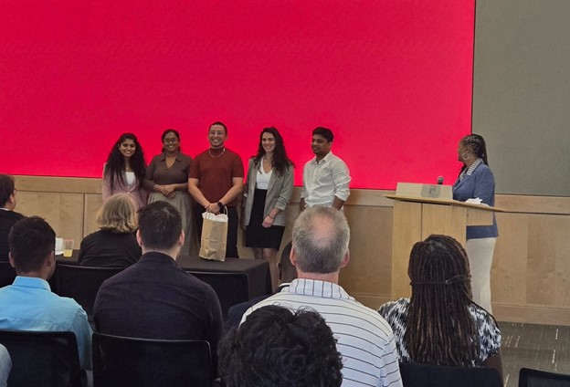 Sumit Saha (far right) and Badí Quinteros (standing in the middle) participated in the 3-Minute Thesis Competition, along with other winners.