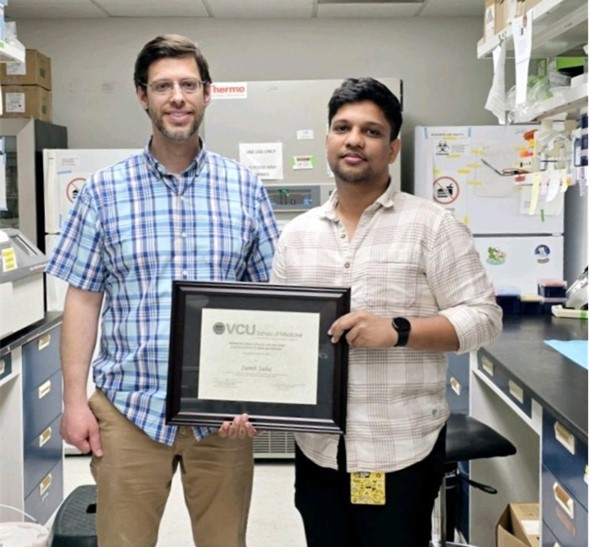Sumit Saha, a 5th-year PhD candidate in the Biochemistry and Molecular Biology program at the Department of Cellular, Molecular, and Genetic Medicine, VCU School of Medicine, has received the prestigious NCI F99/K00 Award. This competitive NIH grant provides support for the final two years of doctoral training (F99) and the first four years of postdoctoral research (K00). Sumit is the only international graduate student at VCU School of Medicine to hold this award, making the achievement especially remarkable.